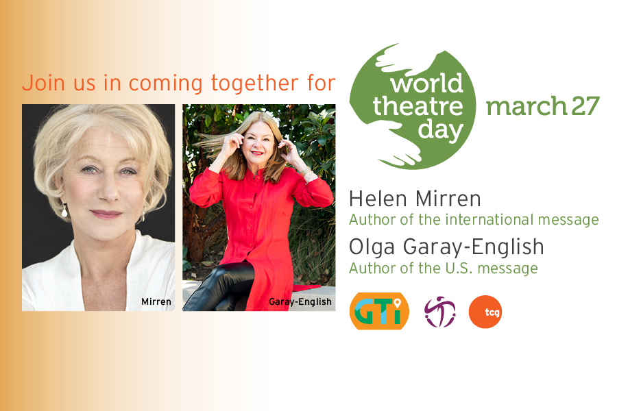 New York, NY – The Global Theater Initiative (GTI), a partnership between Theatre Communications Group (TCG) and The Laboratory for Global Performance and Politics (The Lab) at Georgetown University, invites all theatres, individual artists, institutions, and audiences to celebrate the 60th annual World Theatre Day on March 27, 2021. Each year, a renowned theatre artist of world stature is invited by the International Theatre Institute (ITI) Worldwide to craft an international message to mark the global occasion. This year the International message has been written by British actress Helen Mirren, and the U.S. World Theatre Day message has been given by Olga Garay-English, global arts leader. Both messages have been translated into multiple languages. Read all the World Theatre Day Messages here.